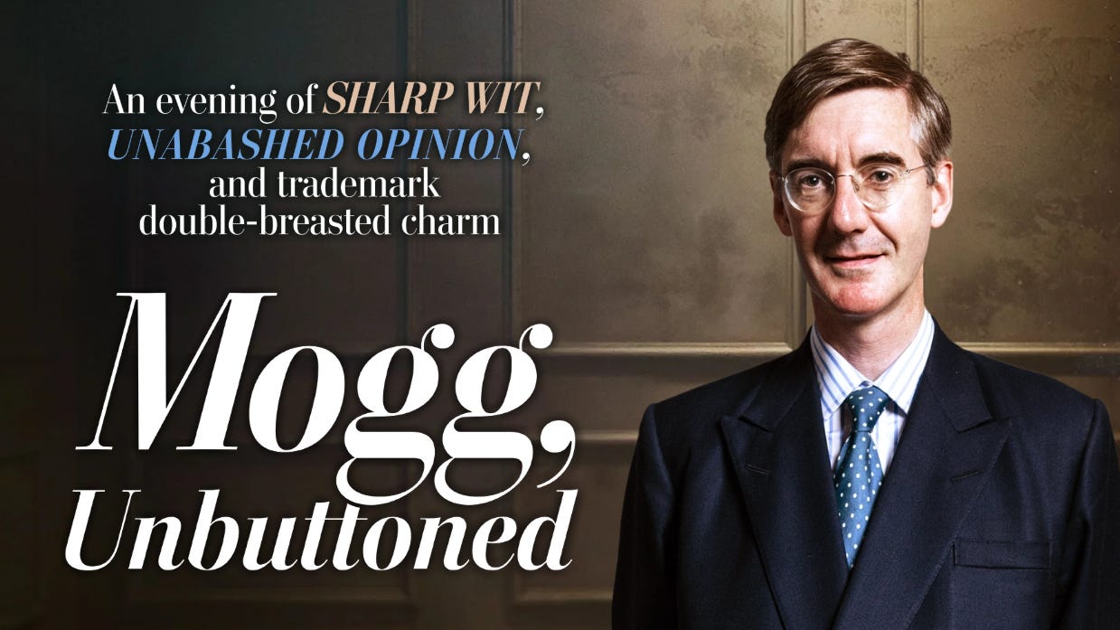 I am delighted to announce the Mogg Unbuttoned tour — a series of live events that will take me from the green benches of Westminster to theatres across the UK.